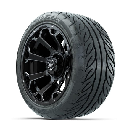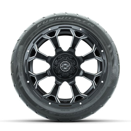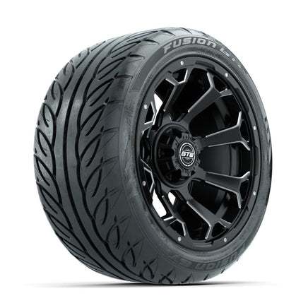 A set of (4) 14-inch GTW® Raven Off-Road Matte Black/Ball Milled golf cart wheels Mounted on 225/40-R14 GTW® Fusion GTR Steel Belted Street Tires