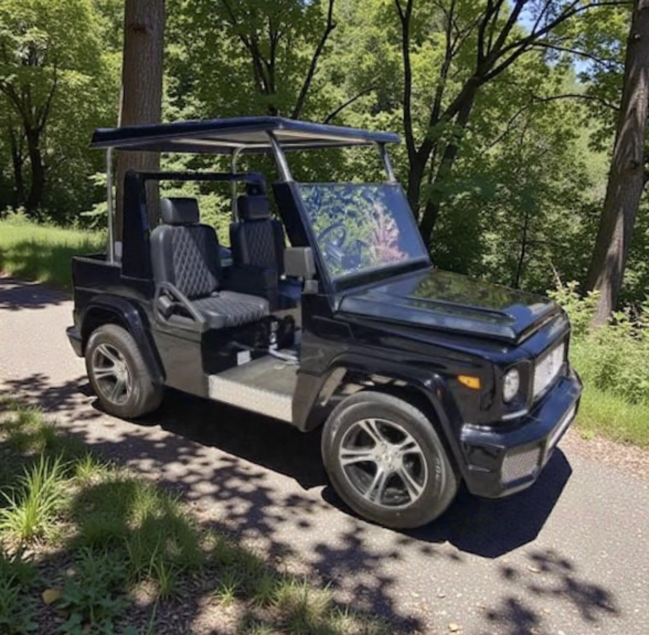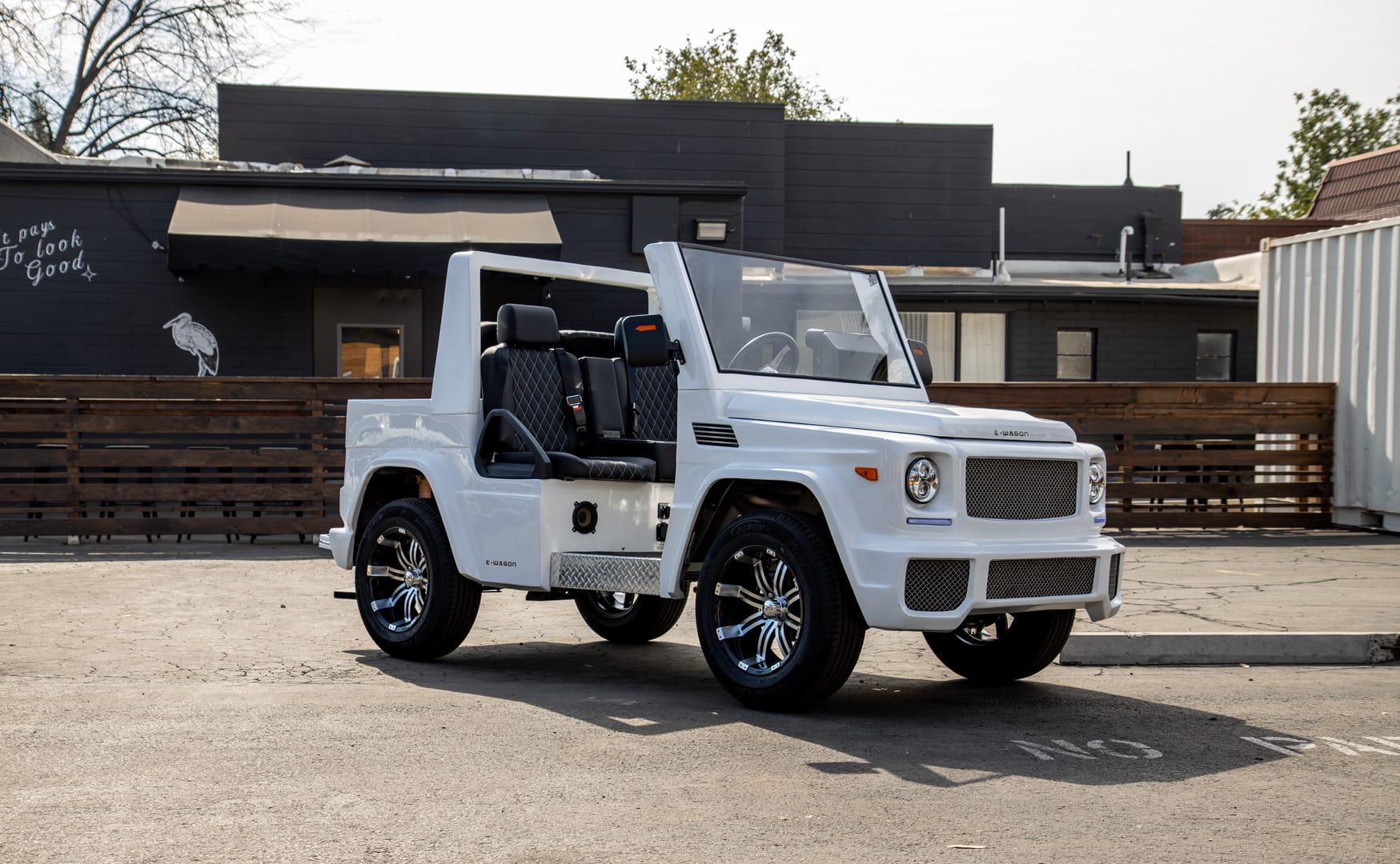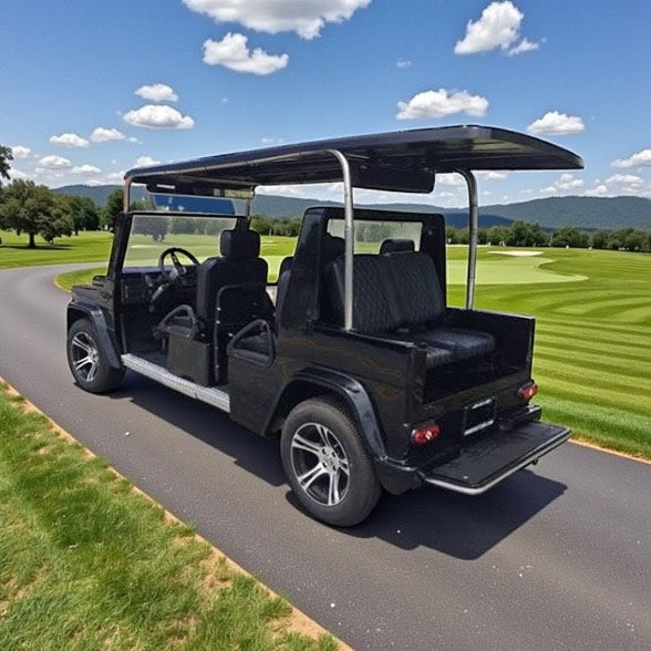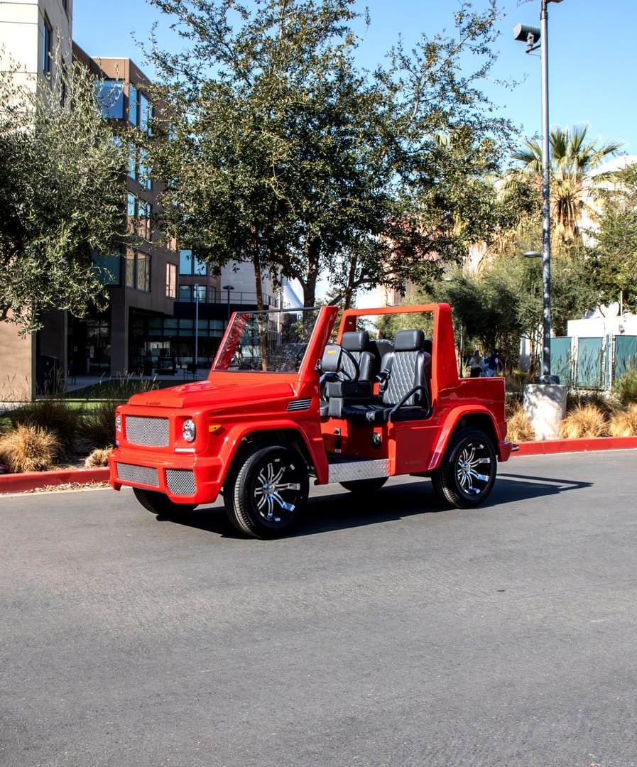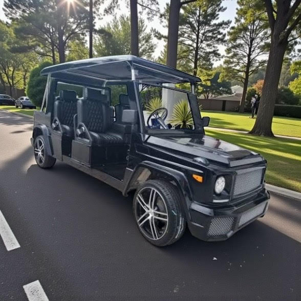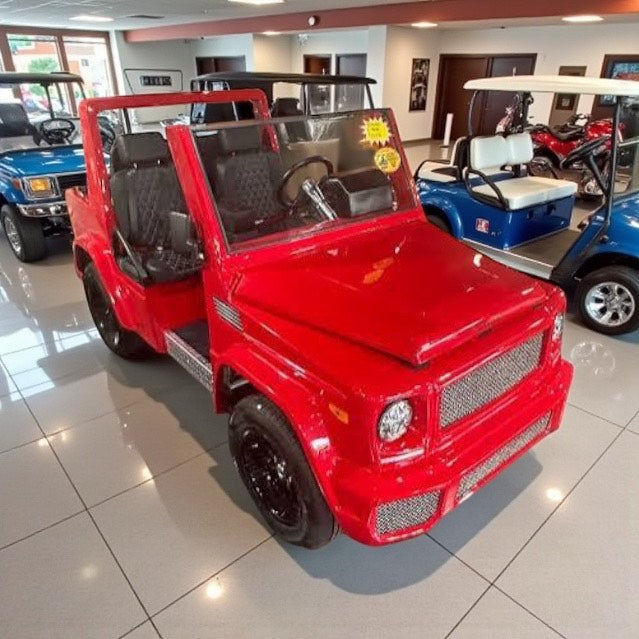 If you are a fan of the G Wagon, you will love the "E Wagon"! Made to perfection mimicking the bells and whistles of the Mercedes G Wagon in class, style, and functionality, with the only difference being size! Cruise around your local golf course or your residential community with the Sleek and Sexy E Wagon for sure catching all eyes! Equipped with a 48V 105AH Lithium Ion battery so you have the most upgraded battery system on the market!