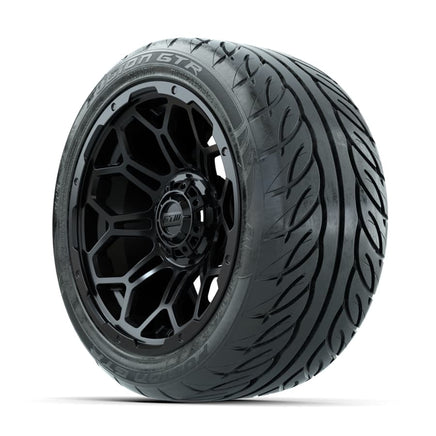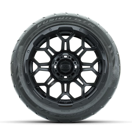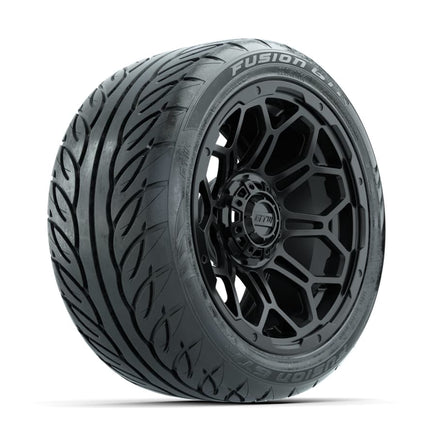 A set of (4) 14-inch GTW® Bravo Matte Black golf cart wheels Mounted on 225/40-R14 GTW® Fusion GTR Steel Belted Street Tires